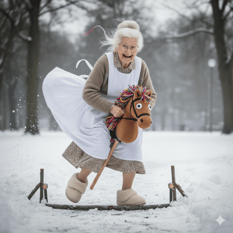 Mein konkretes Ziel laut Ratgeber: „Zweimal pro Woche 30 Minuten reiten gehen, auch im hohen Alter machbar.“ Die Realität im Park hinterm Seniorenheim sieht so aus: Ich galoppiere im Seitwärtsgang los, bis mein sozialer Status im Ort endgültig auf „Exzentrikerin mit Sockentier“ umschlägt. Früher war ich nur „die mit der großen Klappe“, heute bin ich eine Gefahr für den öffentlichen Nahverkehr. Besonders kritisch wird es, wenn Mitreiter Ernst-August mir mit seinem Rollator den Weg abschneidet. Das nenne ich dann „parcoursnahes Hürdenspringen“.