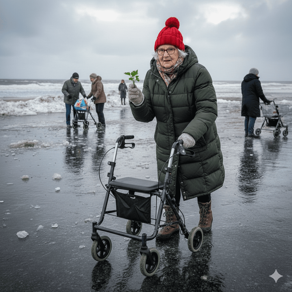 De Supermarkt is proppenvull. Dat süht so ut, as wenn de ganze Senioren-Brigade vun de Stadt ünner dat Suppenkoma liedt un de Wedderwarnungen eenfach ignoreert. Dor warrt Einkaufswagen as Stoßwaffen gegen de annern insett, üm de letzten Tütensuppen un Klorullen to sekern, as wenn de nächste Iestied vör de Döör steiht. Wi rutscht un schlingert över den Parkplatz, as geev dat een Pries för dat riskanteste Hüftgelenks-Manöver vun’t Johr.
